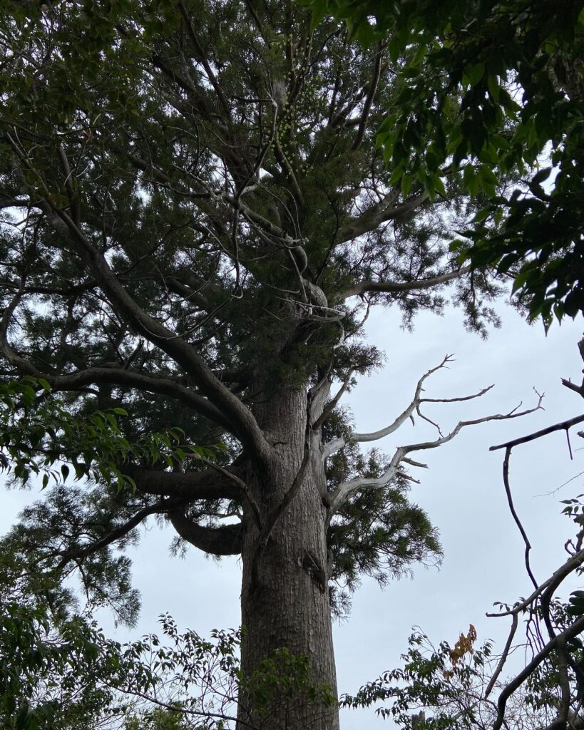 衛守杉は、元々樹齢五百年の一対の夫婦杉と呼ばれていた御神木でありましたが、令和4年に1本が倒伏し、もう1本の方も根元が断裂し、亀裂が10m以上の高さにまで至っておりますが、樹木の養生と土壌改良に加え、コブラツリーケーブリングという最新の技術でこの大木を守っています。(コブラツリーケーブリングは、木の倒伏を防ぐとともに柔軟性のあるケーブルであることから木が大きく揺れることにより新たな発根など木が倒れまいとする働きを促す仕掛けです。)