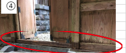 現状:土台及び柱が腐食により潰れており、社殿が下がってきている。壁板の一部にも腐食が見られる。