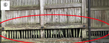 現状:本殿を囲む玉垣(総延長約53m)の土台全面と壁板及び柱の一部が、腐食している。土台や柱の内部が空洞化しており、土台の上の板壁も一部腐食している。