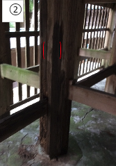 現状:本殿が24本の柱によって支えており、そのうちの10本において下部が腐食している。最大高さ1mぐらいまでシロアリの被害がある。